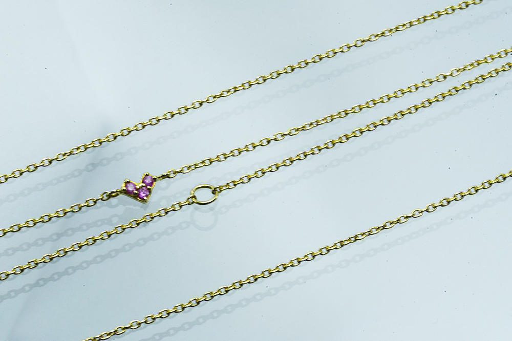 K18ネックレス ダイヤ/色石付 D0.10 1.5g 引き輪金具 中古品 の品物となります。K18製のチェーンネックレスにダイヤ0.10ctプチ、少し上部に小さなハートモチーフにピンク色の色石がついたデザインネックレスとなります。ピンク色の色石は、小さいためどのような色石かわかりません。色だけから推測するとトルマリンかと思われます。フェルト製小ポーチに入れての発送となります。