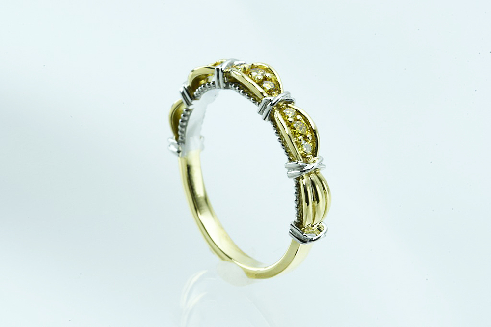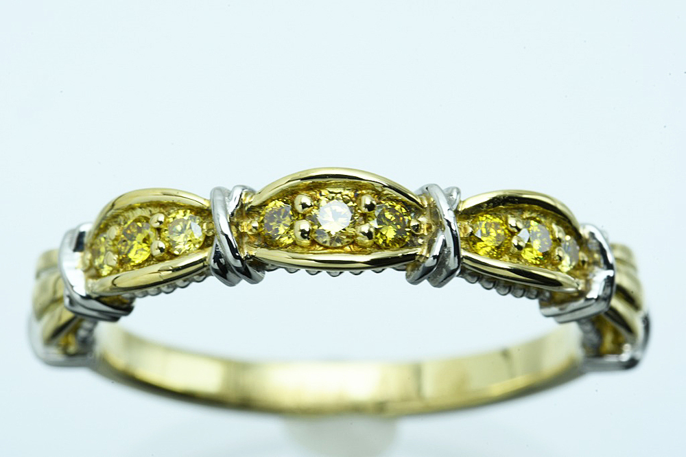 K18+Pt950リング トリートメントダイヤ付デザインリング D0.16 4.2g #15 となります。ほとんど部分はK18製ですが、トップの一部にPt950が使用されております。ダイヤはきれいなイエローでムラがありませので、トリートメント(色付け)だと推測されます。インクルージョンの少ないダイヤが使用されておりますので、キラキラ輝いております。