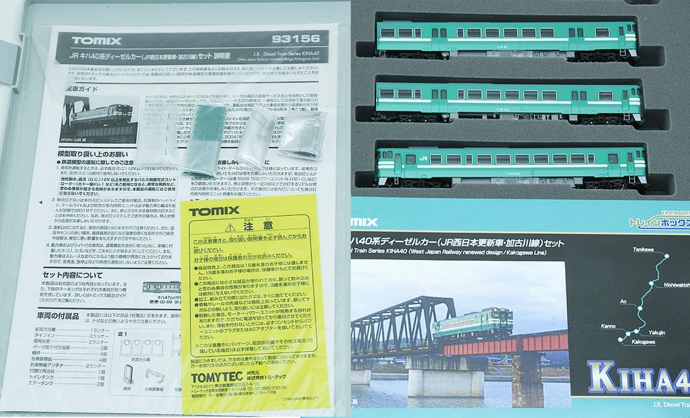 TOMIX 93156 トレインボックス JRキハ40系ディーゼルカー(JR西日本更新車・加古川線)セット となります。資料によると2014年のトレインボックスから限定発売された品物となります。ナックルカプラーは素直に連結してくれるので走行前・走行後の準備が楽チンです。コレクションや増車にいかがでしょうか?