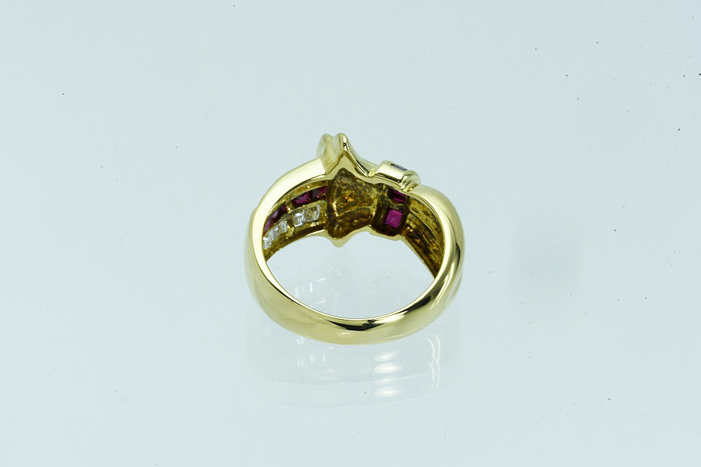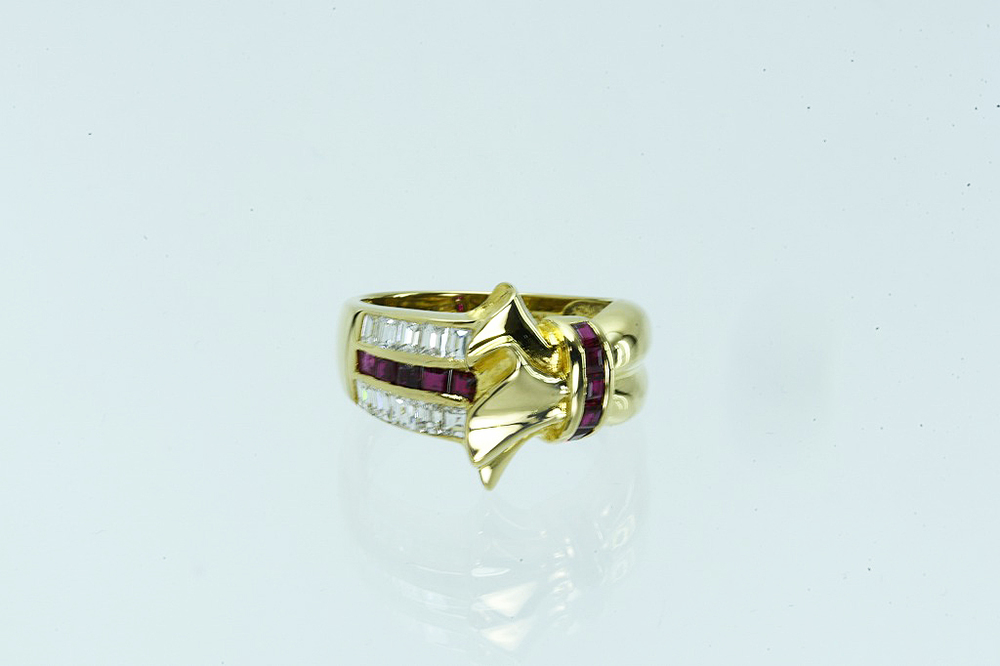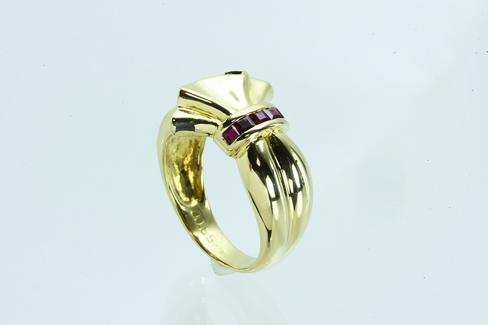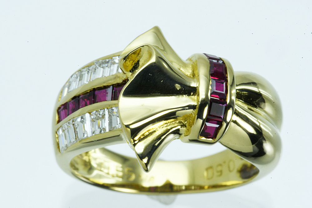 K18リング ルビー/ダイヤ デザインリング R0.50/D0.55 6.6g #12 鑑別 仕上げ となります。リボンモチーフのトップ、サイドにはスクエアカットのダイヤとルビー、リボンモチーフの付け根を縛るようにルビーが一列配置されております。インクルージョンの少ないきれいなダイヤが使われており、ギラギラとした輝きがあります。ルビーには傷があるものの、きれいな深みのある色をしております。