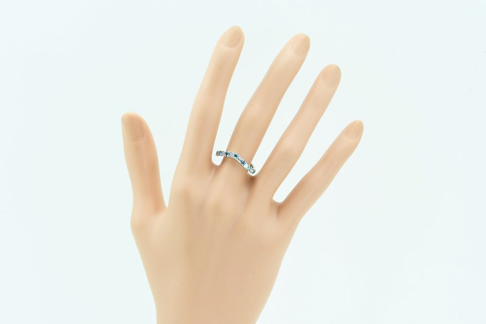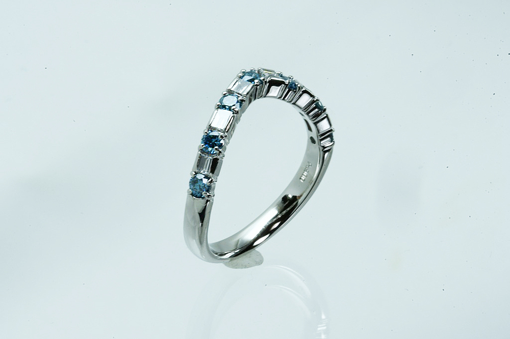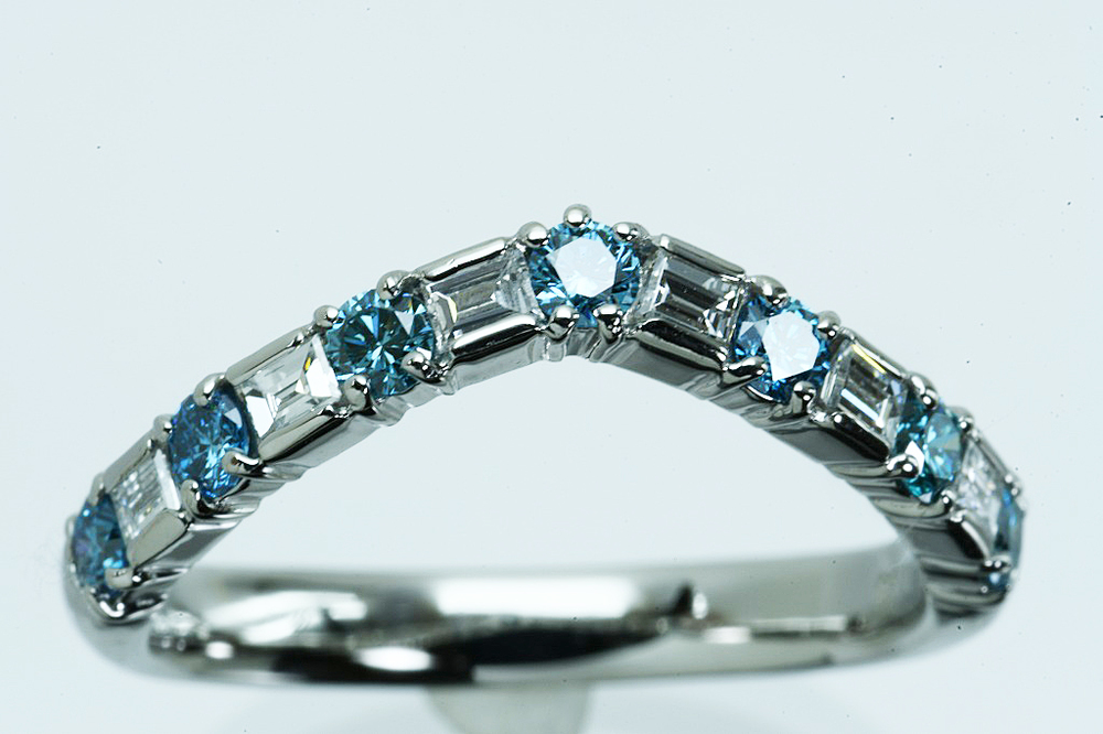 Pt900リング ダイヤ(トリートメント含)デザインリング 0.25/0.46ct 4.9g #15 仕上げ となります。トップはV字一文字、青く染められたトリートメントダイヤとプリンセスカットダイヤが、交互に一列に並んでおります。トリートメントダイヤは0.46ct、プリンセスカットダイヤは0.25ctが爪留めされております。爽やかな印象のプラチナリングとなっております。