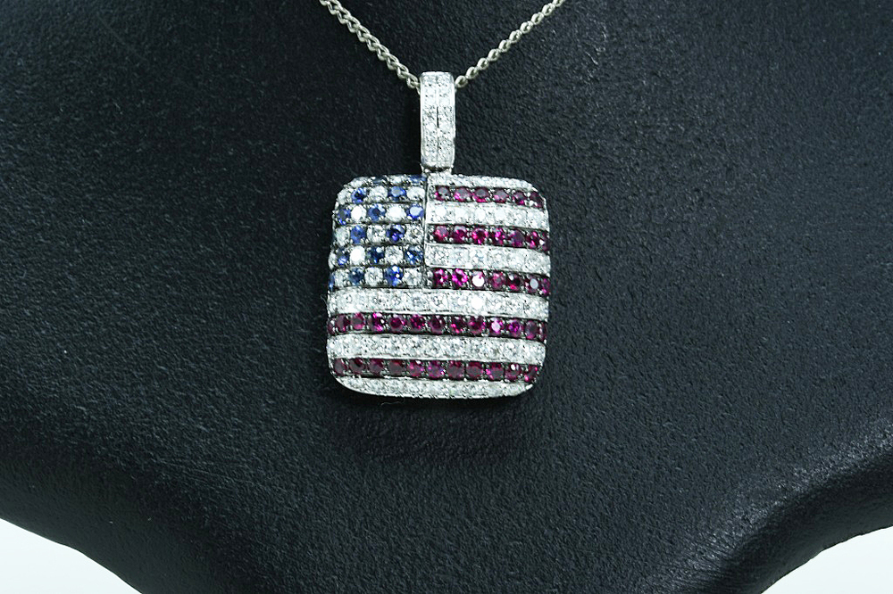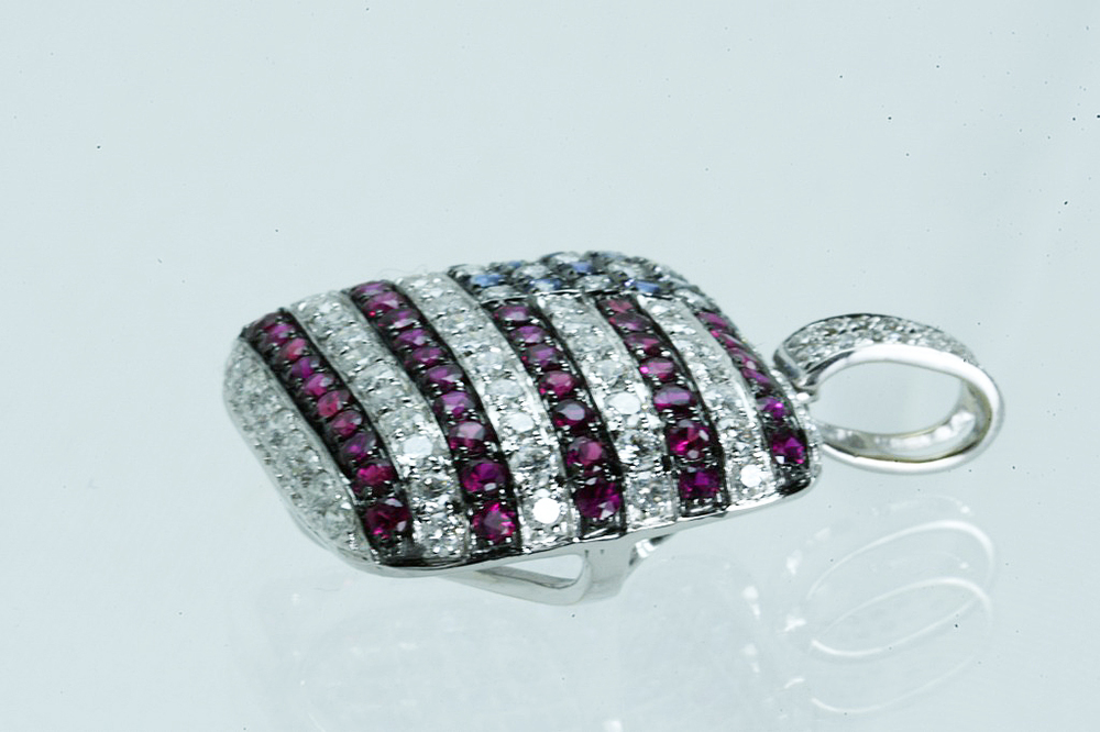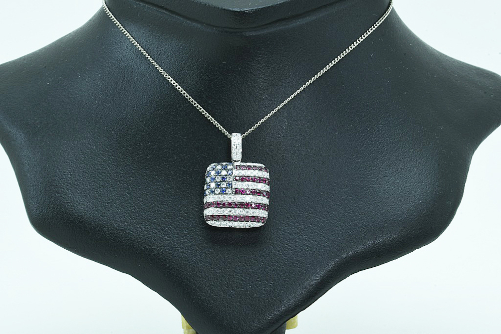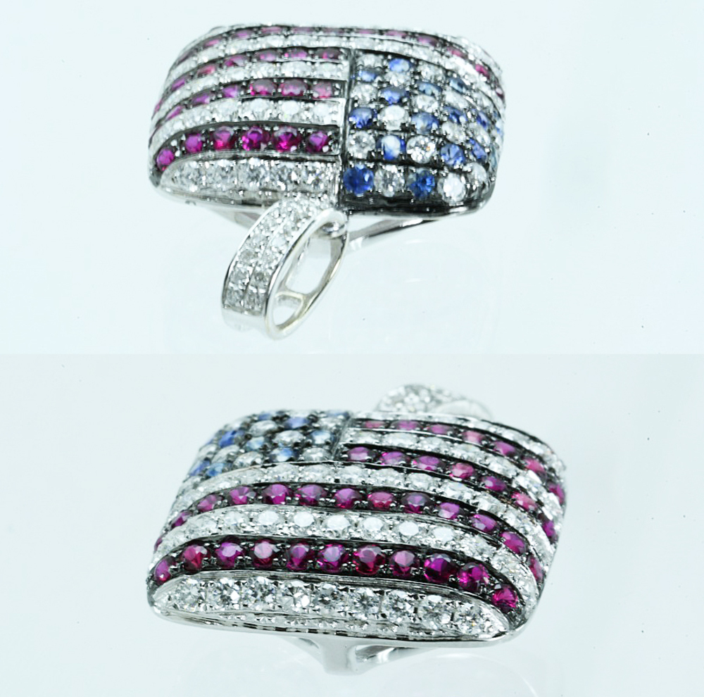 K18WGペンダントトップ 星条旗モチーフ USA ダイヤ/ルビー/サファイア D1.05/R0.70/S0.25 4.1g 仕上げ済 の品物となります。星条旗(USA)モチーフのペンダントトップとなります。赤のストライプの部分には、ダイヤ54個/ルビー44個、星にあたる部分には、ダイヤ17個/サファイア16個、金具部分にはダイヤ16個が爪留めされております。厚みのある立体的なペンダントトップで、小さいですが胸元での存在感はピカイチです。