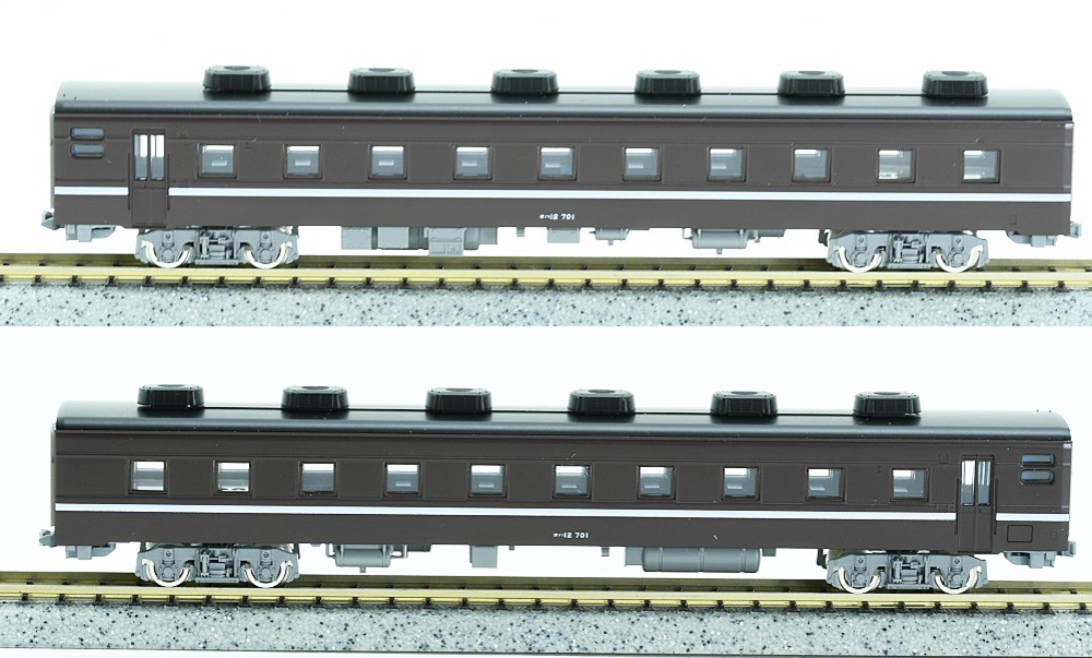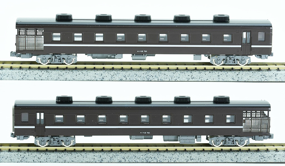 非常にきれいな中古品の品物となります。テールマークが取り付けられておりますので、何度か走行させた客車だと推測されます。付属品の袋が一部開封されております。車両は非常にきれいな状態です。発売時の資料によるとアーノルドカプラー仕様なのですが、すべてナックルカプラーに交換されております。もともとのアーノルドカプラーは付属しておりません。外箱は保管時についたと思われる傷がございます。動作確認のため走行させております。ご了承ください。