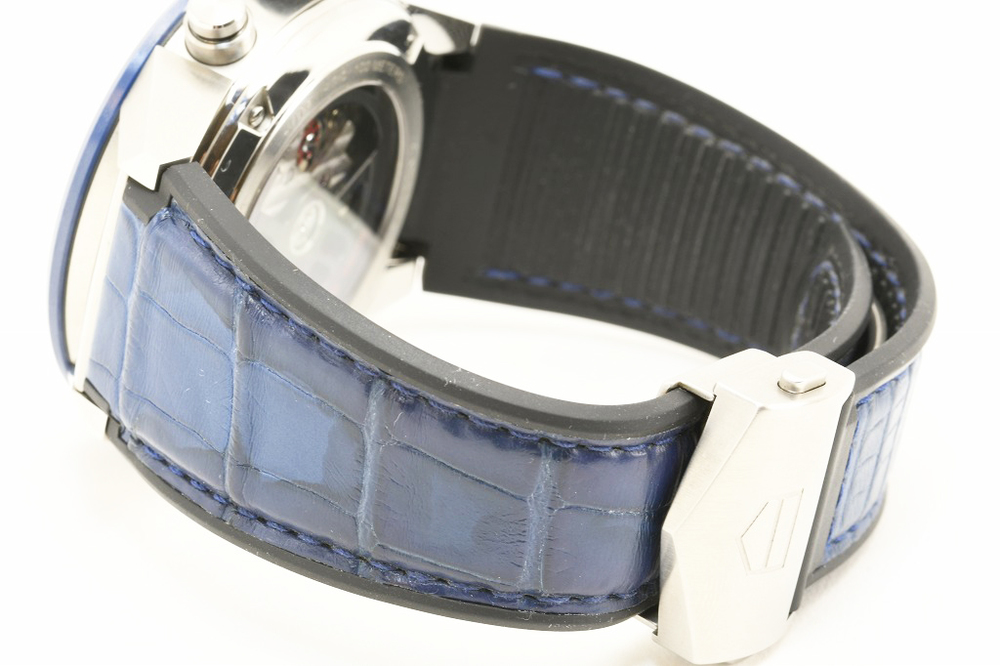 タグホイヤーのカレラ ホイヤー01 クロノグラフ スケルトン Ref.CAR201Tとなります。本体はステンレス、ベゼルはセラミック、ベルトは表がアリゲーター/裏面がラバーとなっております。ベルトは簡単にご自分で調整することができます。スケルトン仕様なので、正直クロノグラフの視認性は悪いです。しかし、機械好きにはメカメカしくて、ワクワクする腕時計です。12時・6時方向がクロノグラフの分針・時間針、9時方向目玉が通常の秒針となります。