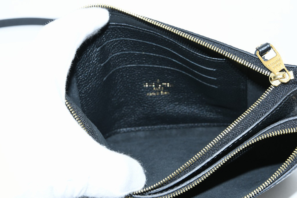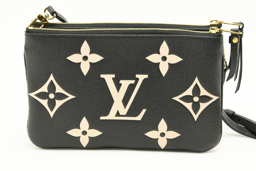 ルイヴィトン ポシェット・ドゥーブルジップ バイカラーモノグラムアンプラントです。斜め掛けできるポシェットとして、貴重品を収納する長財布としてお使いいただけます。専用の小銭入れはございませのでお札・小銭はバラバラと入れていただくことになります。チャック付きのポシェットが2つくっついた形。中央にも小物を入れることができます。素材は大きなモノグラム柄のバイカラーモノグラムアンプラントレザーが使われております。色はブラック/ベージュで、カード入れ部分は3枚仕様、その裏側に小物ポケットがございます。