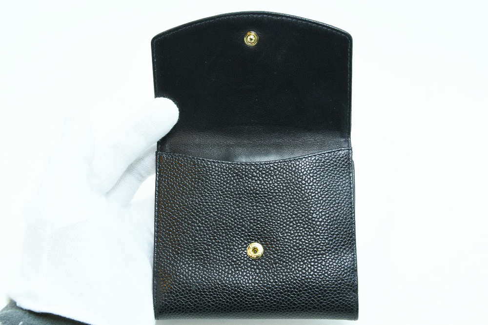 シャネル CHANEL 2つ折り Wホック 財布 キャビアスキン 黒 となります。シャネル定番のWホック財布です。現行品はロゴマークや財布外観が少し変更されております。比較的コンパクトなお財布で、札入れ1カ所、小銭入れ1カ所、カード入れ6カ所、小物入れ2カ所となります。