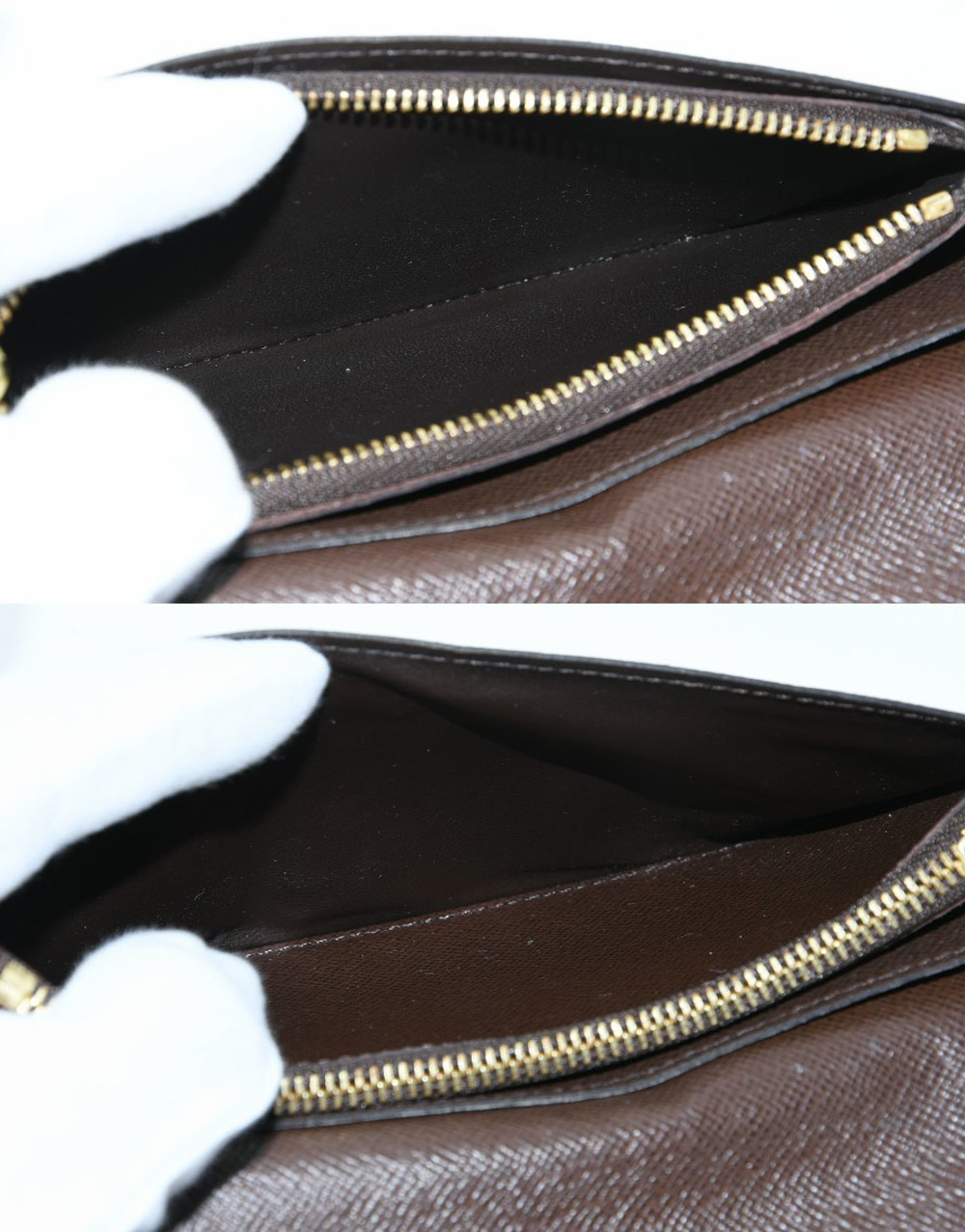 中古品の品物となります。ダミエ地に大きな傷、汚れ、シミ、シワ、型崩れなく綺麗な状態です。財布の四角にすり傷がございます。内部はカード入れ部分にくっきりとカードを入れた跡が残っています。小銭入れ内部は、使用に伴う汚れで、黒く汚れております。金具には小傷が付いております。柔軟剤の臭いと思われる石鹸臭が全体についております。鼻を近づけると匂います。全体的にクリーナーで清掃しております。写真や動画で程度を確認していただけます。