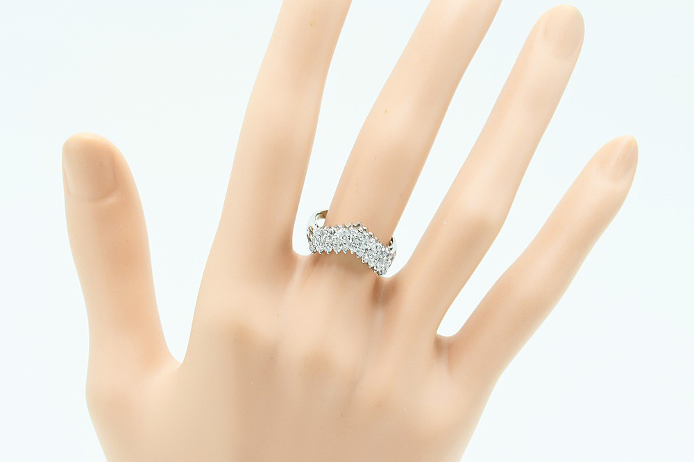 Pt900リング V字ダイヤ デザインセットリング D0.70 となります。昭和中期ごろに流行ったV字ダイヤリングです。マーキスやペアシェイプのダイヤが使用されることが多いリングですが、こちらはラウンドブリリアントカットのダイヤが使用されております。内包物があるものや、色のついたもの、ダイヤの質的には統一されていませんが、メレダイヤの量が多く、ボリューム感がございます。単体で使用していただいてもOK、大き目のダイヤリングと一緒に、セットリングとして使用していただいてもOK。昭和レトロな雰囲気プンプンのクレシックなデザインのV字ダイヤリングです。