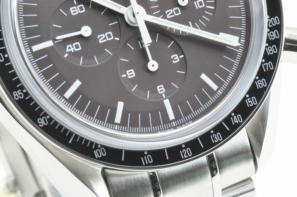 スピードマスタープロフェッショナルの50周年記念モデルです。文字板がブラウンダイヤルです。通常の黒文字板のモデルと並べてみないとわからないレベルで、ブラウンでも全く違和感はありません。裏スケなので手巻きのムーブメントを見ることができます。バンドサイズは余コマ2つを付けての腕回りサイズとなります。