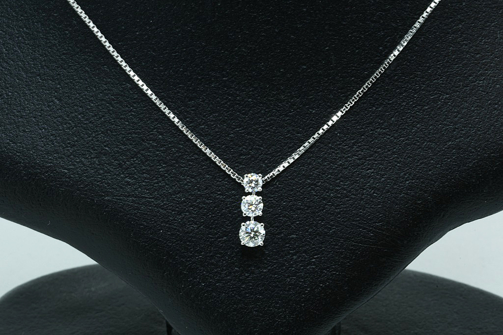 Pt850ベネチアンネックレス フリー金具付 Pt900トップ ダイヤ3石 D0.53 4.7g となります。ネックレスはPt850のベネチアンネックレス、トップはPt900製、ダイヤ3石 合計0.53ctトップ付です。太いベネチアンネックレスには自由に長さ調整可能なフリー金具がついております。長さは最大約45cmと長めのネックレスとなります。トップの大中小のダイヤ3石は色は少しあるものの、インクルージョン(内包物)が少ないため、キラキラ輝いております。トップはネックレスから取り外すことはできません。