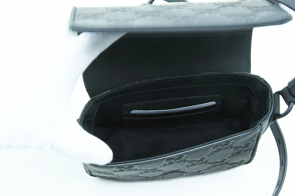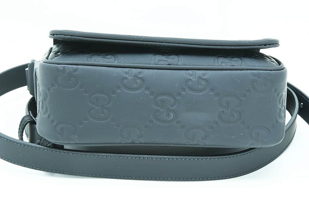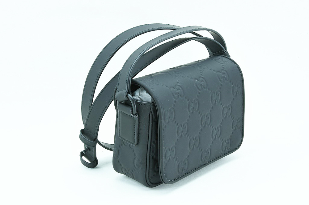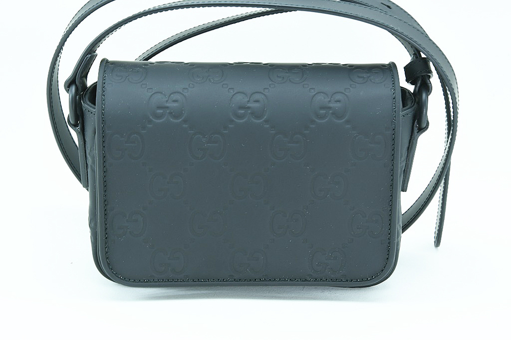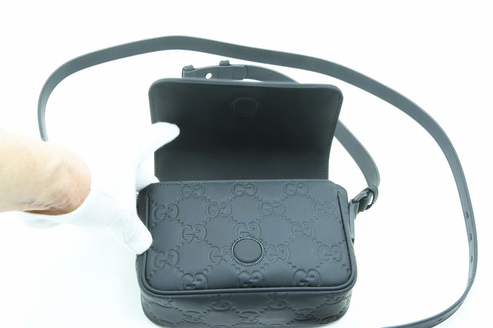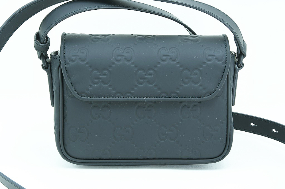 グッチ GUCCI GGラバー エフェクト ミニメッセンジャーバッグ 黒 794062 未使用品 となります。GGラバーエフェクトというラバーのようなマットな質感ながら、実はレザーという2024年に登場した新素材です。GGエンボス加工が非常に生える素材です。ショルダーストラップは長く、基本的に斜め掛けで使用していただく、ミニメッセンジャーとなります。内部にはカード入れが2か所のみというシンプルな構造。カブセはマグネットで開閉するタイプとなります。