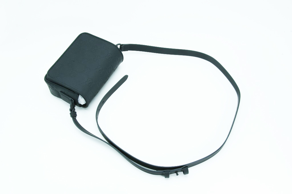 未使用品の品物となります。未使用品ですが、店頭展示されておりましたので、GGラバーエフェクト地部分に、ショルダーストラップが擦れて、小さな傷や小さなスレがございます。ストラップ部分にも金具が擦れてできた小さな傷がございます。ストラップは、丸く巻かれて本体裏側でまとめられておりましたので、丸く型がついております。ラバーのようなマットな質感のレザーなので、通常のレザーより小さなほこりが付きやすいと感じました。写真や動画で程度を確認していただけます。