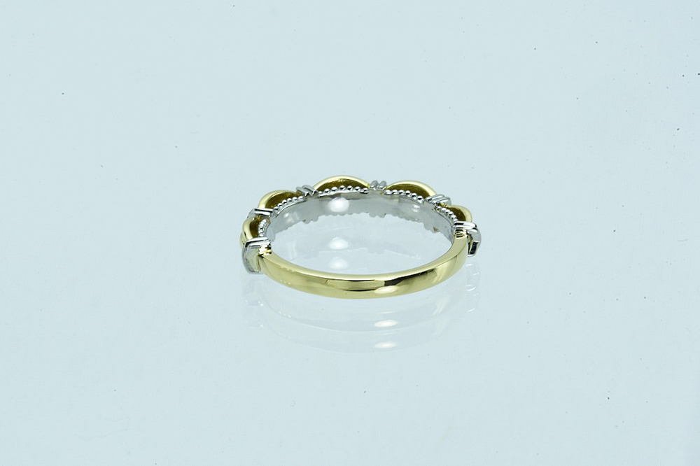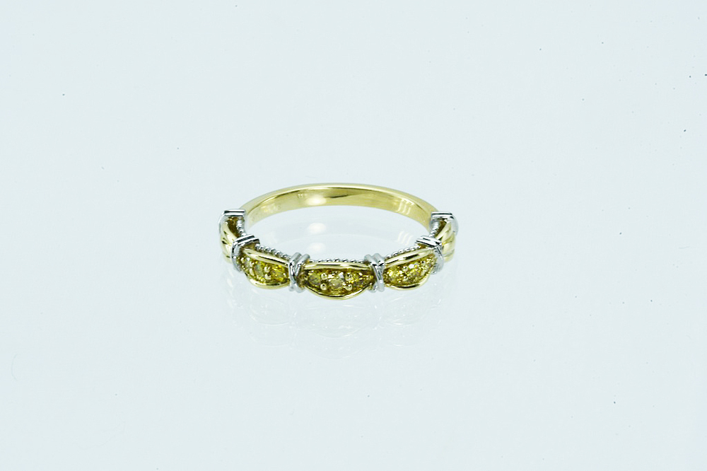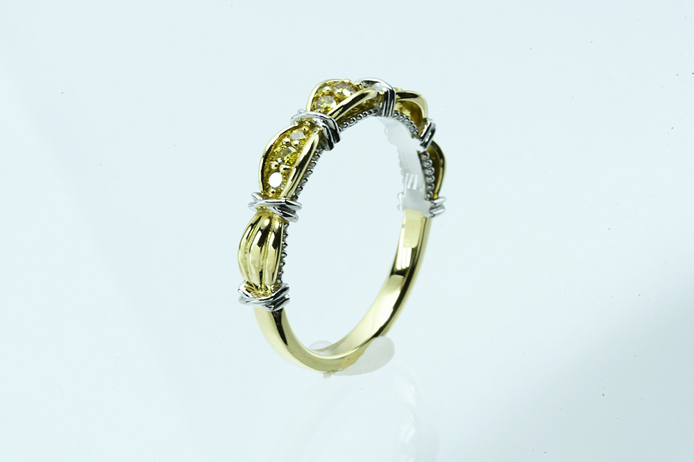 K18+Pt950リング トリートメントダイヤ付デザインリング D0.16 4.2g #15 となります。ほとんど部分はK18製ですが、トップの一部にPt950が使用されております。ダイヤはきれいなイエローでムラがありませので、トリートメント(色付け)だと推測されます。インクルージョンの少ないダイヤが使用されておりますので、キラキラ輝いております。