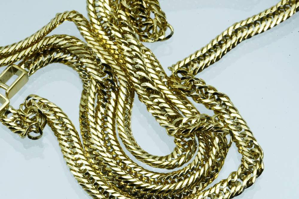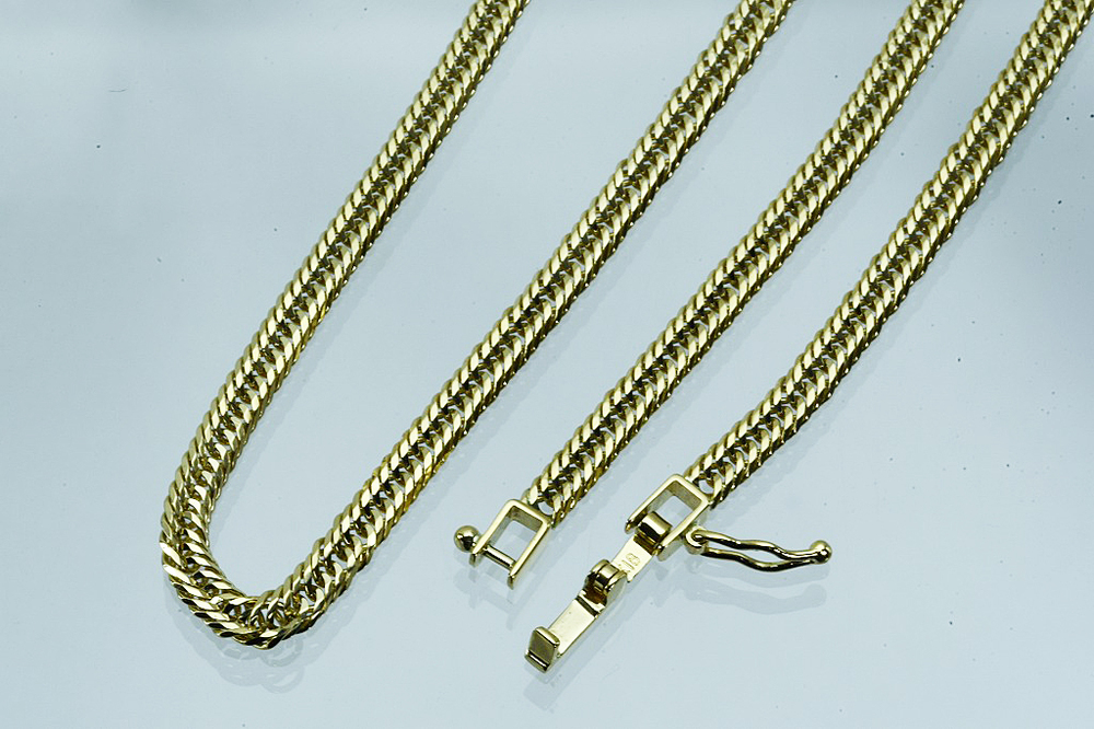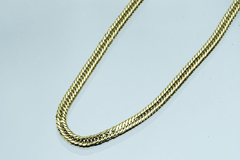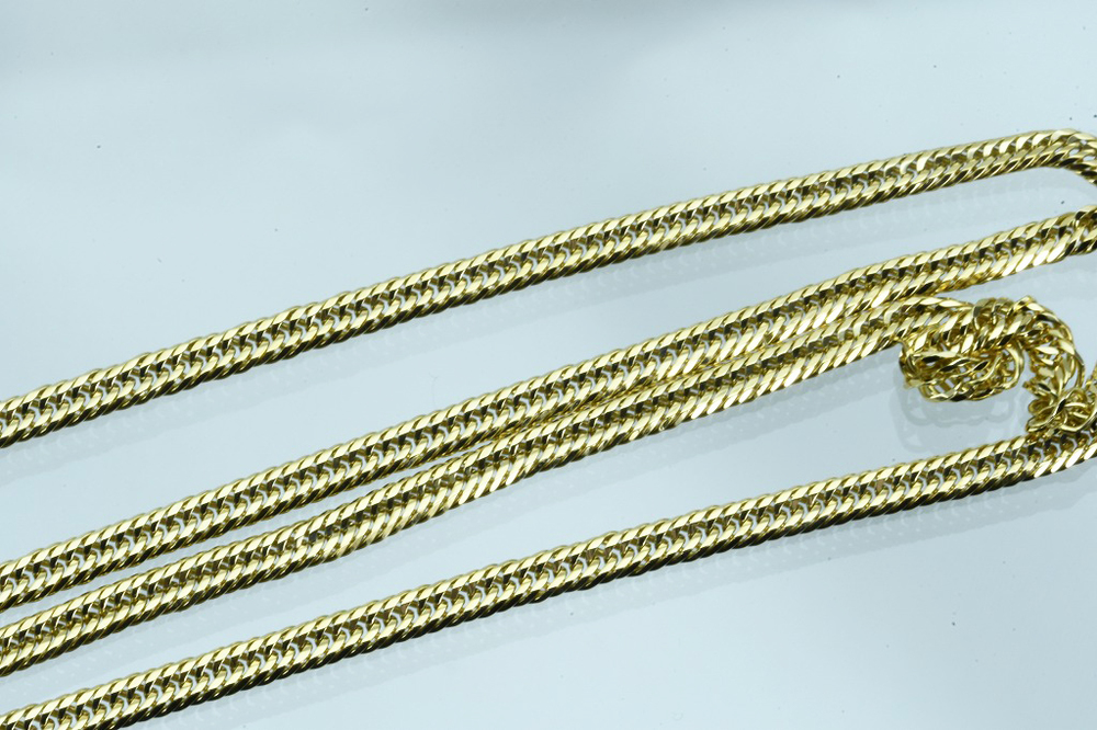 中古品の品物となります。弊社にて仕上げ(磨き)その後、超音波洗浄を行いました。大きく目立つような傷はございませんが、喜平12面のため、細かな部分の仕上げができておりませので、まだ小傷がたくさん残ったままの状態です。中折れ金具部分にまだ小傷が残っている部分がございます。喜平エッジ部分が新品時と比べると摩耗して丸くなっている部分がございます。中古品を簡易仕上げしておりますので、小傷はまだ残ったままの状態です。写真や動画で程度を確認していただけます。