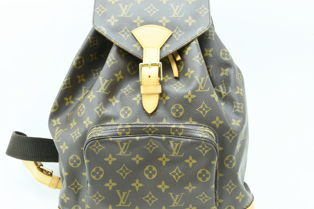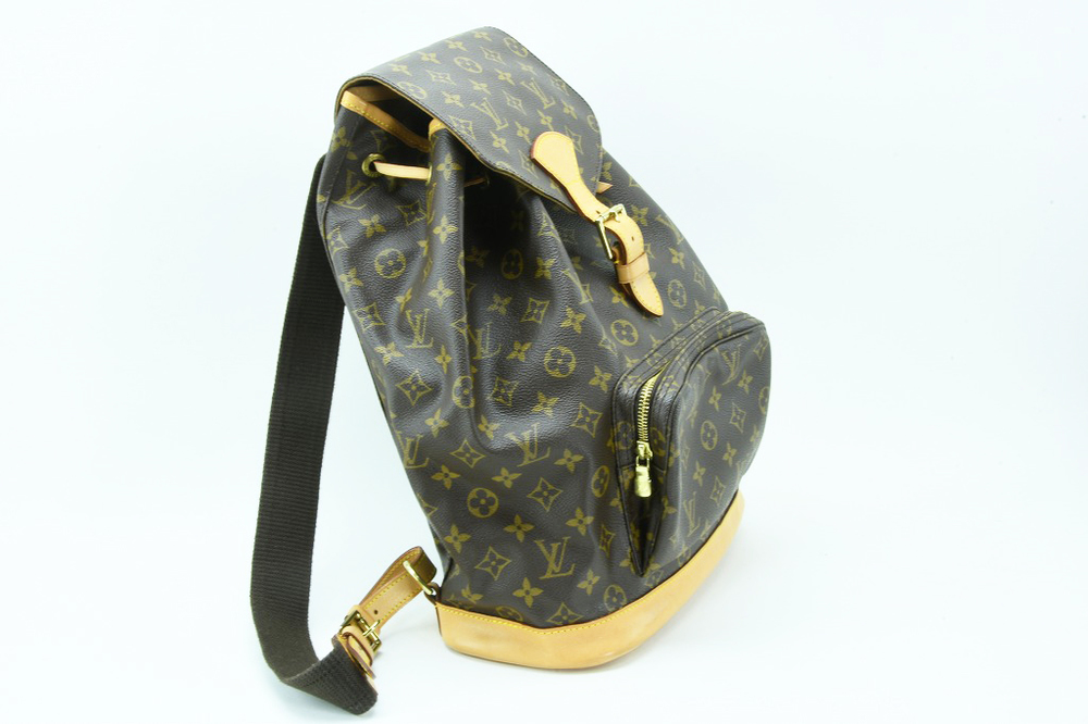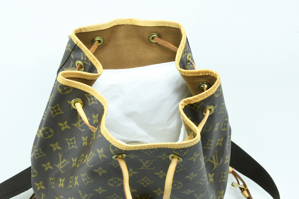 ルイヴィトン LOUIS VITTON モンスリGM モノグラム リュック M51135 となります。廃番になった旧モンスリの一番大きなサイズとなります。たくさん荷物を入れても、肩に食い込みにくいコットン製のストラップとなっております。開口部は巾着バッグのようなヌメ紐で絞って閉じるタイプです。カブセは尾錠金具で開け閉めするようになっております。