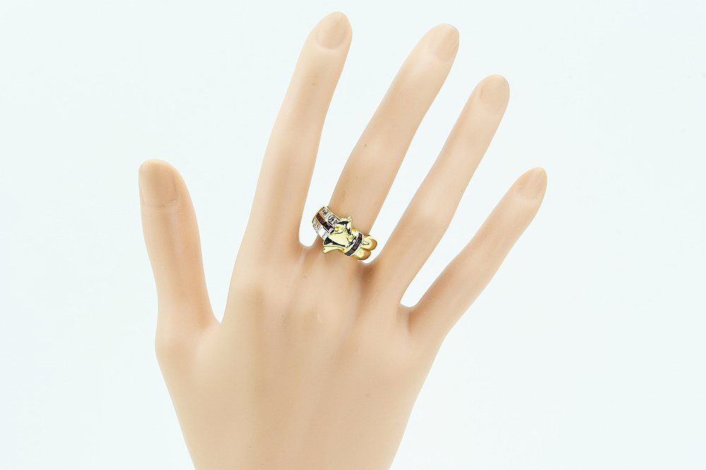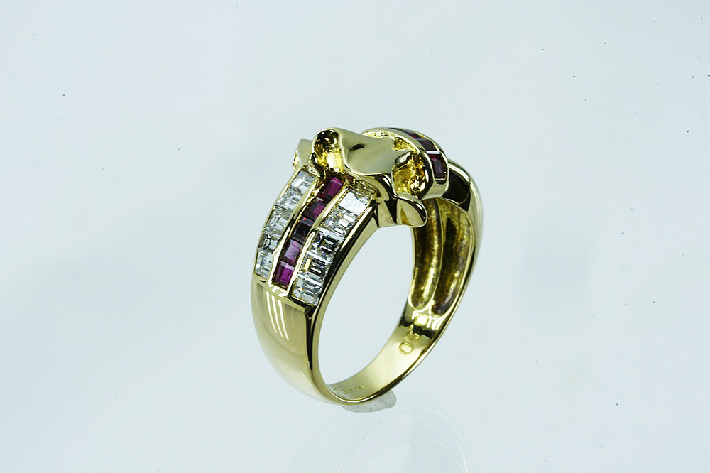 K18リング ルビー/ダイヤ デザインリング R0.50/D0.55 6.6g #12 鑑別 仕上げ となります。リボンモチーフのトップ、サイドにはスクエアカットのダイヤとルビー、リボンモチーフの付け根を縛るようにルビーが一列配置されております。インクルージョンの少ないきれいなダイヤが使われており、ギラギラとした輝きがあります。ルビーには傷があるものの、きれいな深みのある色をしております。