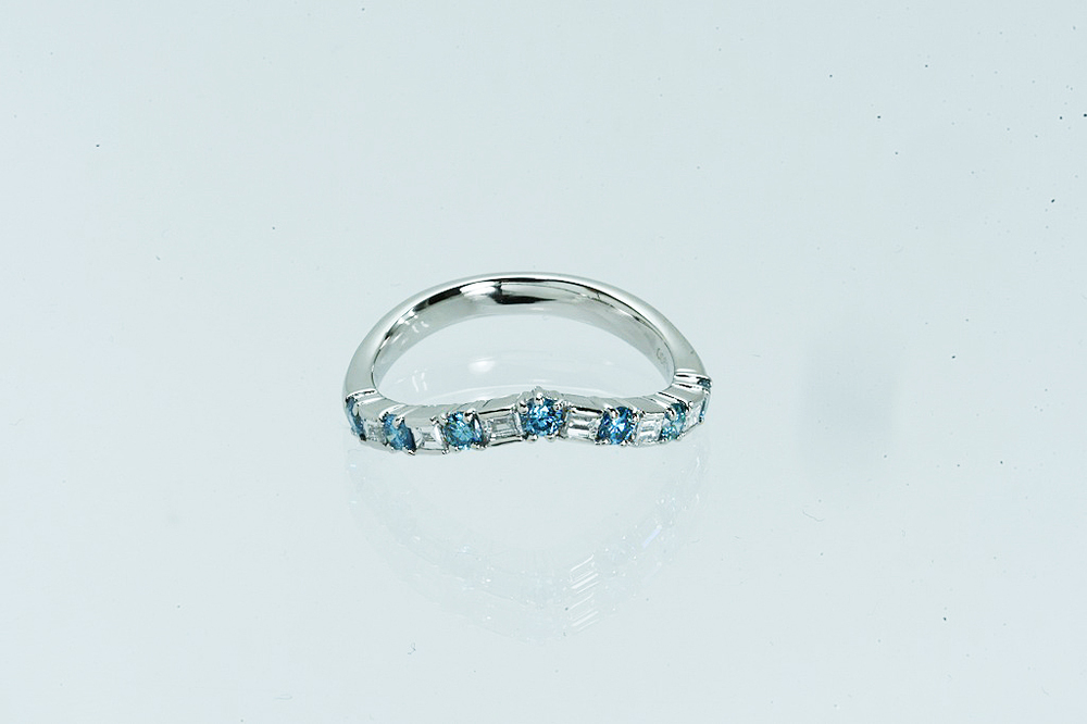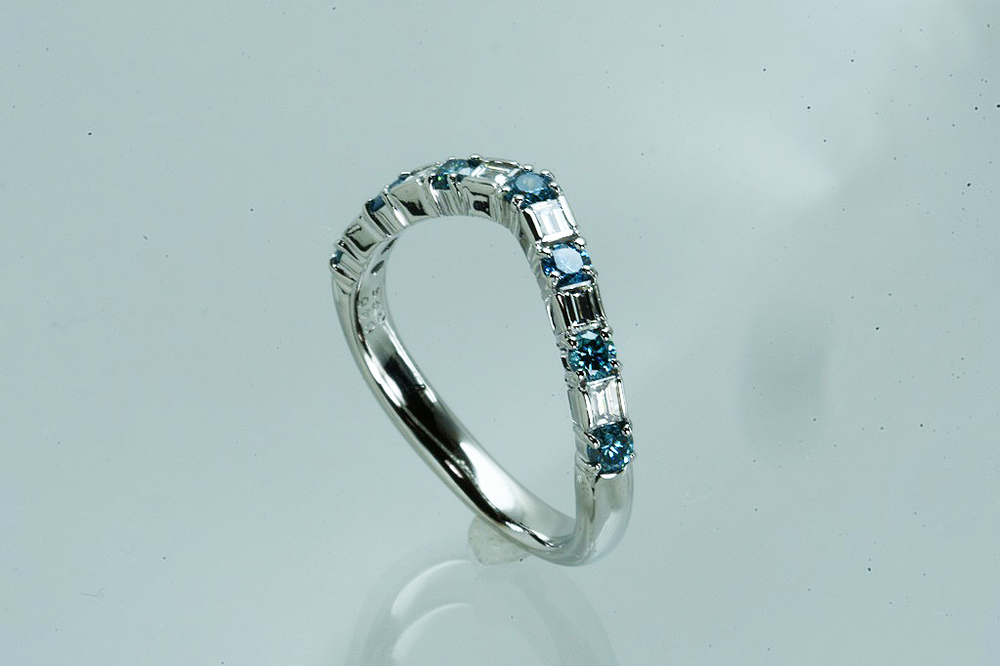 Pt900リング ダイヤ(トリートメント含)デザインリング 0.25/0.46ct 4.9g #15 仕上げ となります。トップはV字一文字、青く染められたトリートメントダイヤとプリンセスカットダイヤが、交互に一列に並んでおります。トリートメントダイヤは0.46ct、プリンセスカットダイヤは0.25ctが爪留めされております。爽やかな印象のプラチナリングとなっております。