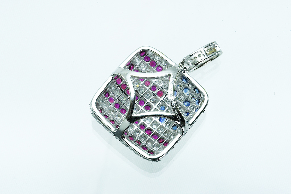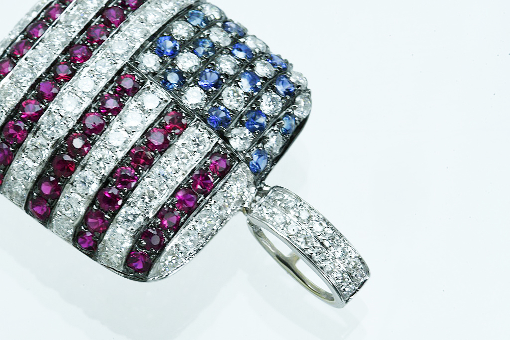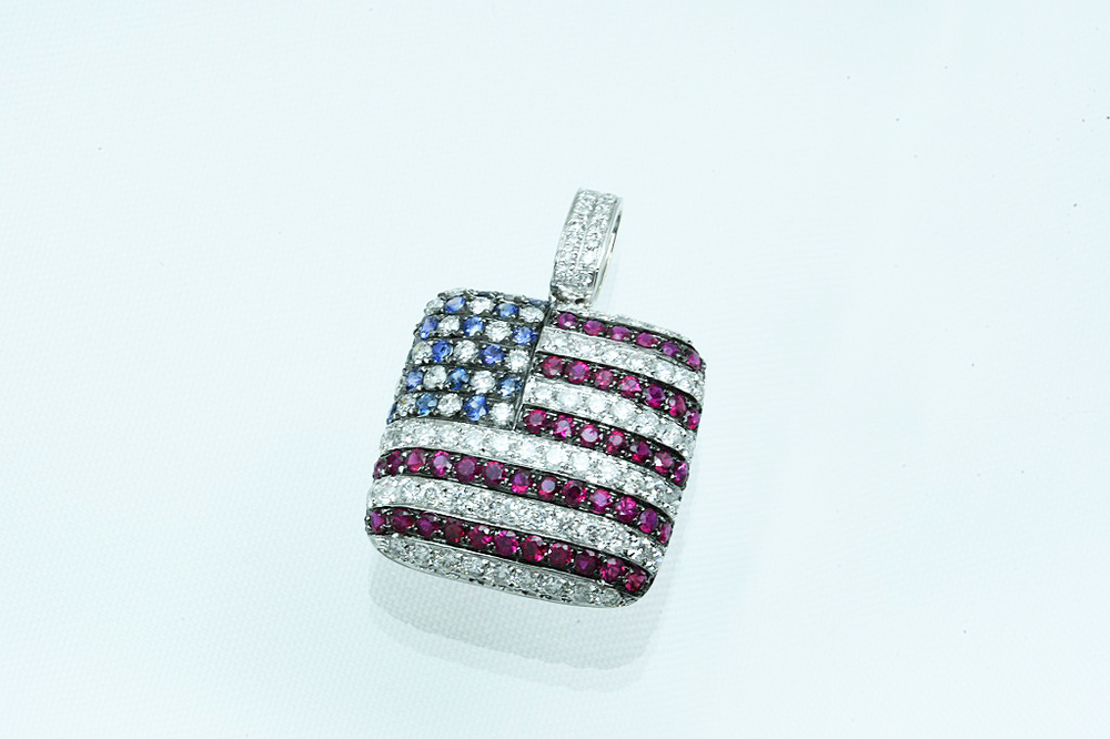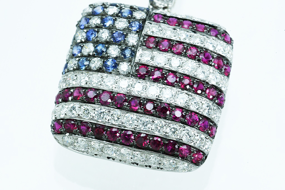 K18WGペンダントトップ 星条旗モチーフ USA ダイヤ/ルビー/サファイア D1.05/R0.70/S0.25 4.1g 仕上げ済 の品物となります。星条旗(USA)モチーフのペンダントトップとなります。赤のストライプの部分には、ダイヤ54個/ルビー44個、星にあたる部分には、ダイヤ17個/サファイア16個、金具部分にはダイヤ16個が爪留めされております。厚みのある立体的なペンダントトップで、小さいですが胸元での存在感はピカイチです。