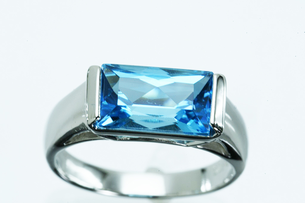 Pt900リング ブルートパーズ 5.0g #9 鑑別 仕上げ 中古品 となります。四角い大きな色石に用いられる「ステップカット」という形状のブルートパーズが1石付いております。深みのあるブルーが爽やかな印象のリングです。鑑別書がございます。