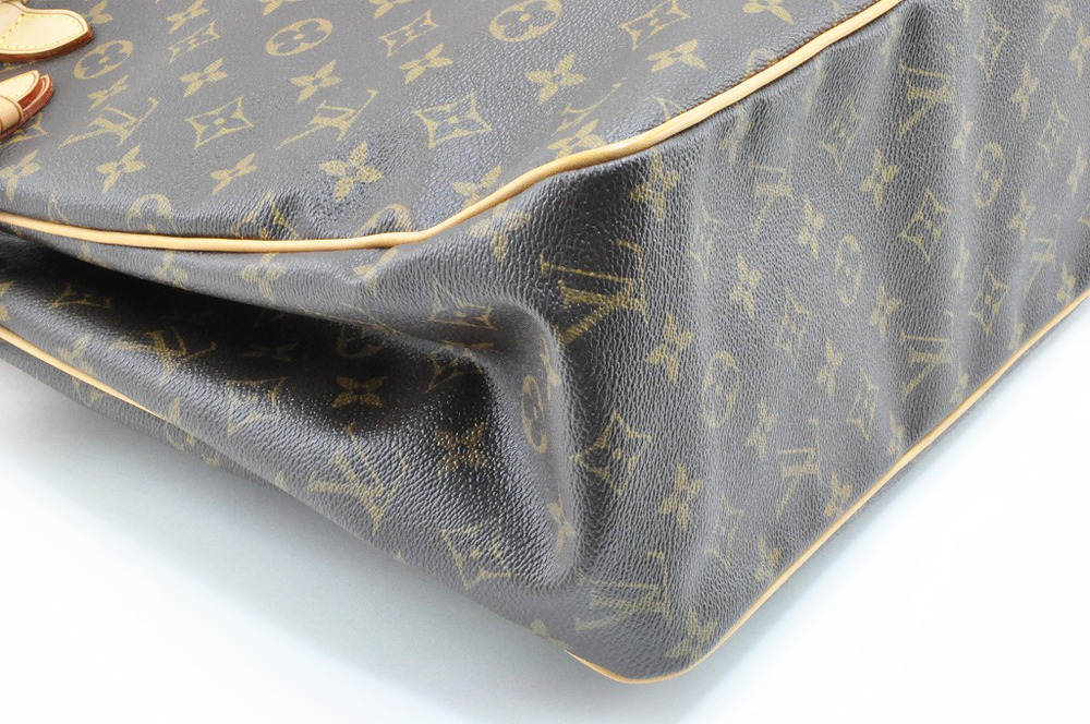 中古品の品物となります。モノグラム地は全体的に少しテカリがみられるもの、大きな汚れ、シミ、傷等ない状態です。新品の品物と比較すると、モノグラムの柄が少し薄く感じられます。内部は綺麗な状態で、汚れやシミ等はありません。持ち手部分のヌメ革はそんなにやけてなく、雨シミや汚れもほとんどありません。バッグ開口部付近のヌメ革は持ち手よりやけており、汚れで少し黒ずんでいるところが見られます。持ち手はバッグに沿って保管されていましたので、型がついています。写真・動画にてご確認ください。