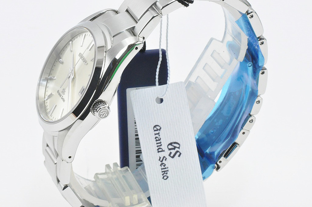 グランドセイコーの定評のある9Fクォーツモデル。広告にダルビッシュ投手と一緒に掲載されたモデルです。飾り気がなく『シンプル イズ ベスト』を貫くモデル。文字板はシルバー、3針、デイト付。ON/OFF問わず使用していただけるモデルです。