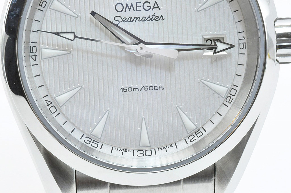 シーマスターアクアテラ150mクォーツモデルです。本格的な150m防水仕様のベーシックなシーマスターアクアテラとなります。文字板は白で、「チークコンセプト」と呼ばれる縦縞模様の装飾が施されています。2016年2月にブランドショップで購入された品物です。