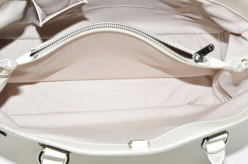持ち手の長いトート系ショルダーバッグ、パッシィGMです。内部は3つに大きく分かれており、真ん中にチャック付きの仕切り兼小物ポケットがあります。A4サイズ雑誌が横向きにすっぽり収まります。持ち手は少し長く、肩にかけて抱えることができます。色はイヴォワール(白)です。