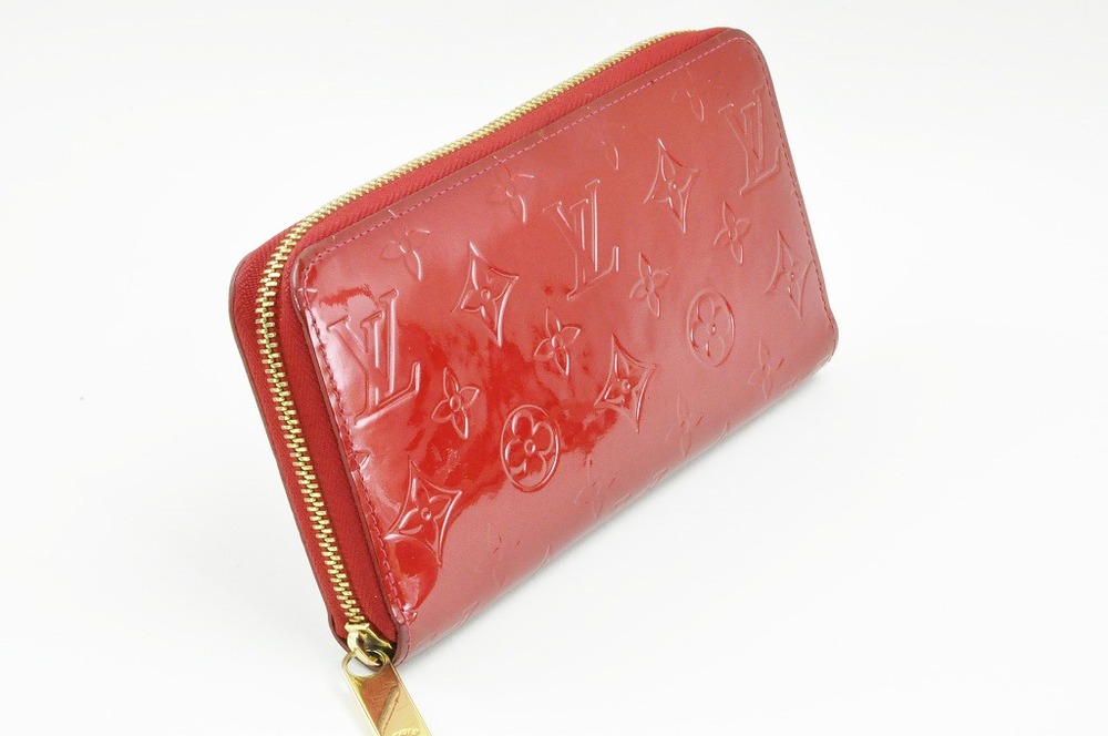 人気のヴェルニ素材のジッピーウォレット、長財布です。使い勝手の良さと、カード、小物、お札ともたくさん入れることができるので人気です。色は赤系のポムダムールだと推測されます。赤の中でもベーシックな赤色だと思います。現在は廃番色です。
