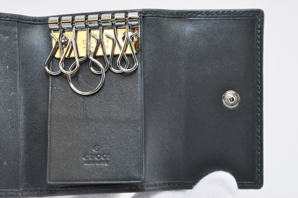 樹脂コーティングされた素材に型押しでGG柄が刻まれたインプリメ素材のキーケースです。汚れや傷に強く毎日使うキーケースに最適です。色はダークグレーメタリックのような感じです。正式な色名はわかりません。