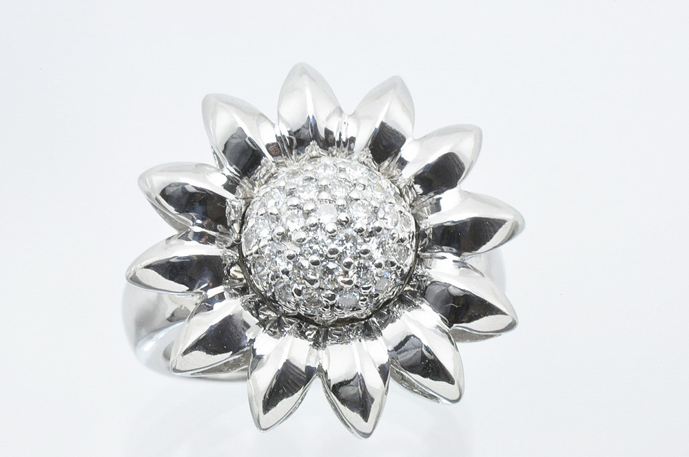 K18WGリング、ダイヤ付きデザインリングです。非常にしっかりした作りの、厚みのある指輪で、重量が11.8gもあります。ひまわりの花をモチーフにしていると思われます。中央部分にダイヤが0.39ct配置されています。使われているダイヤは、色が少しあるものの、内包物の少ない綺麗なメレダイヤが使われています。ジュエリーマキさんのリングとなります。