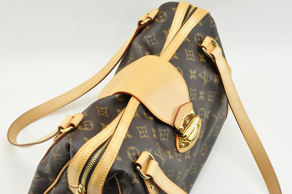 中古品の品物となります。モノグラム地本体は綺麗な状態です。内部内ポケット側面に薄い小さな白い汚れがあります。ヌメ革は全体的にいい色にやけています。上部の金具の付いた帯状部分に小傷や少し汚れがあります。持ち手部分にも薄く汚れがあります。長く使用されておらず、長期保管されておりましたので、底近辺に型崩れがあります。使用頻度は少ない品物だと推測されます。