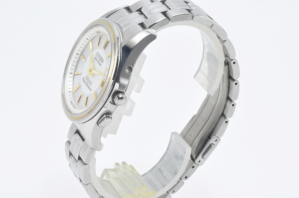 シチズンのエクシードエコドライブです。ソーラー電波時計のため電池交換や時刻合わせが不要です。素材はチタン(Ti)製で軽くて丈夫です。バーインデックスと針の一部がGPになっており、視認性の良い落ち着いた腕時計です。