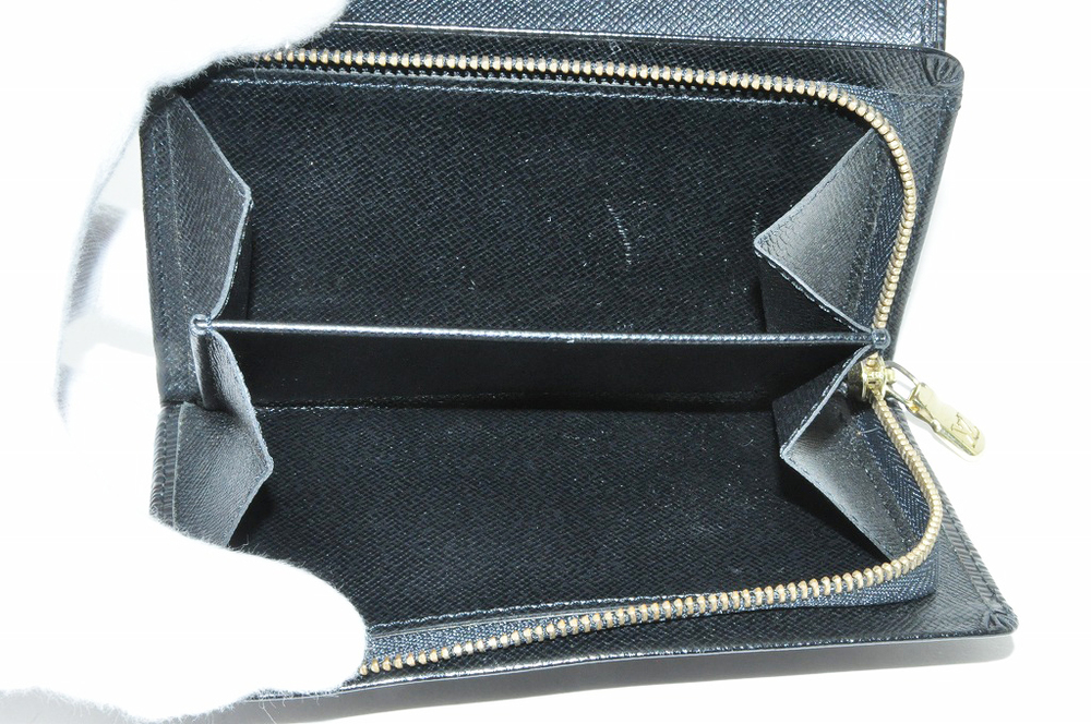 ルイヴィトンL字ファスナーの小銭入れが付いた2つ折り財布です。札入れ1カ所、小銭入れ1カ所、小物入れ4カ所で、カード専用収納部分がありません。カードは小物入れにみなさん収納されています。廃番品の品物です。