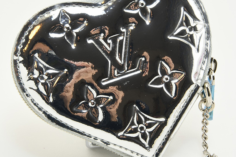 ルイヴィトンのハート型コインケース、ポルトモネクール モノグラム・ミロワールです。エンボス+エナメル加工されたミロワール、色はシルバー(アルジャン)でキラキラです。本体には長めのチェーン付金具がありますので、バッグ内のDリング等に掛けることができます。