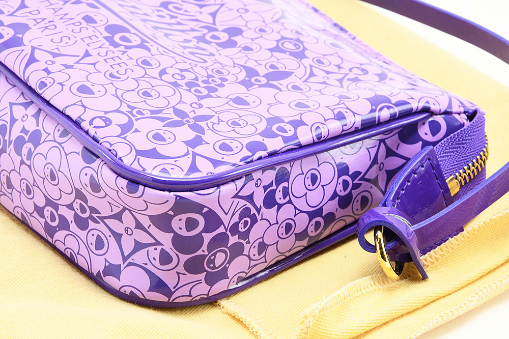 ルイヴィトンの村上隆氏とのコラボ コスミックブラッサムのポシェットです。色は紫系のヴィオレとなります。サイズ的にはレギュラー品のアクセサリーポーチと同サイズです。持ち手は本体から取り外し可能です。