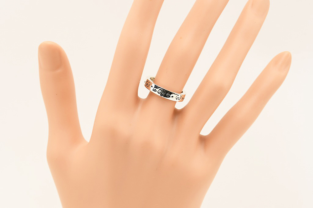 グッチ シルバーリング ゴーストとなります。幅は一番細いタイプの4mmです。エングレービング手法を用いて、グッチのロゴが彫り込まれています。『ゴースト』という名のとうり、お化けチックな「GG」ロゴとスカルがお出迎えです。指輪のサイズ表記は「14」となりますので、日本サイズ約13.6号となります。実測は13号弱です。
